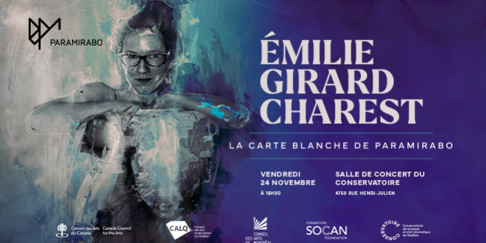 L’ensemble renommé Paramirabo présente son prochain concert intitulé Carte Blanche à Émilie Girard-Charest, une soirée exceptionnelle de musique contemporaine en codiffusion avec le Conservatoire de Musique de Montréal. L’événement aura lieu le 24 novembre à 19h30 à la Salle de concert du Conservatoire.